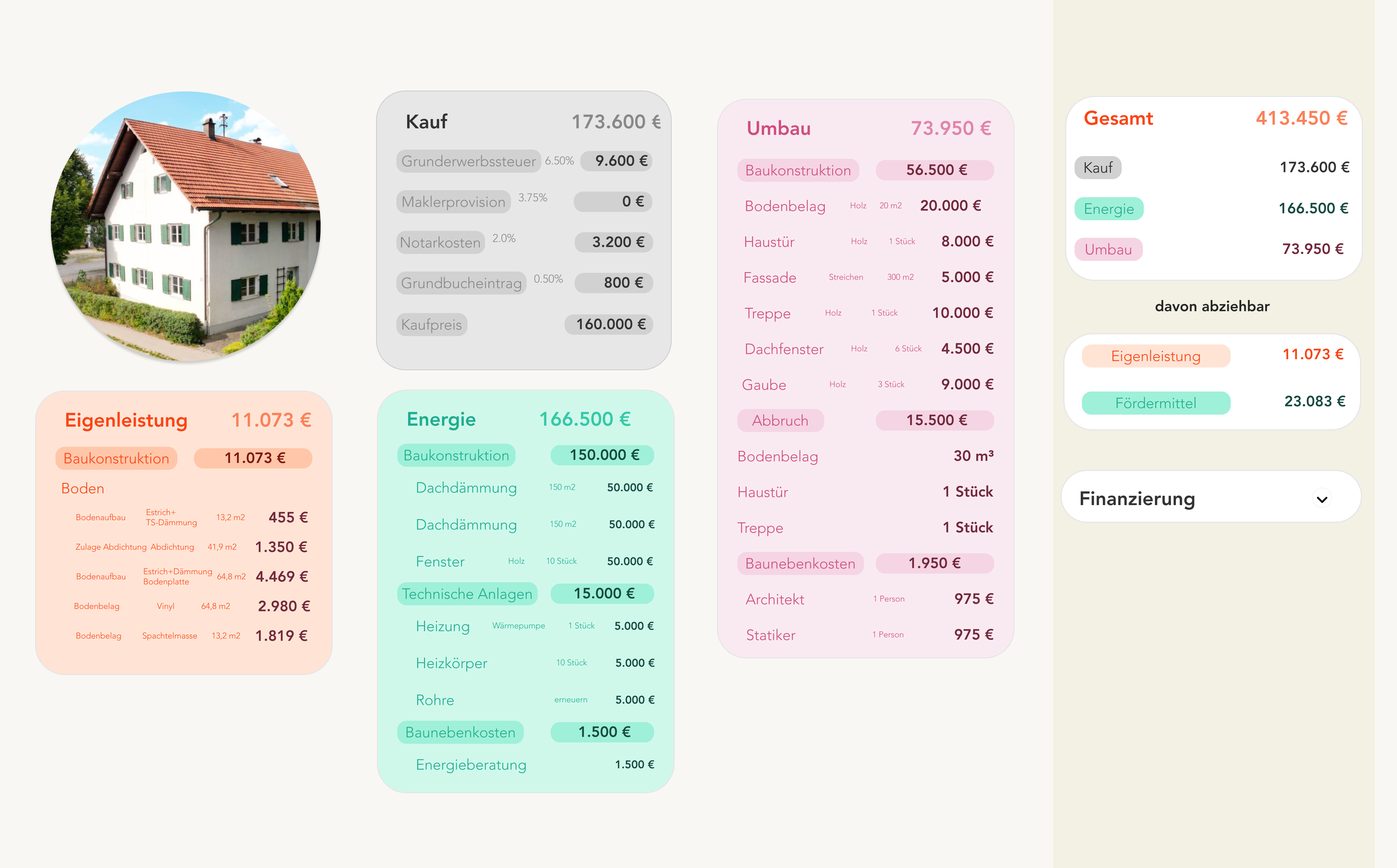 Erhalte eine individuelle Kostenschätzung für deinen Umbau, inkl. energetischer Sanierung & Fördermöglichkeiten. Perfekt für eine sichere Finanzierungsplanung.