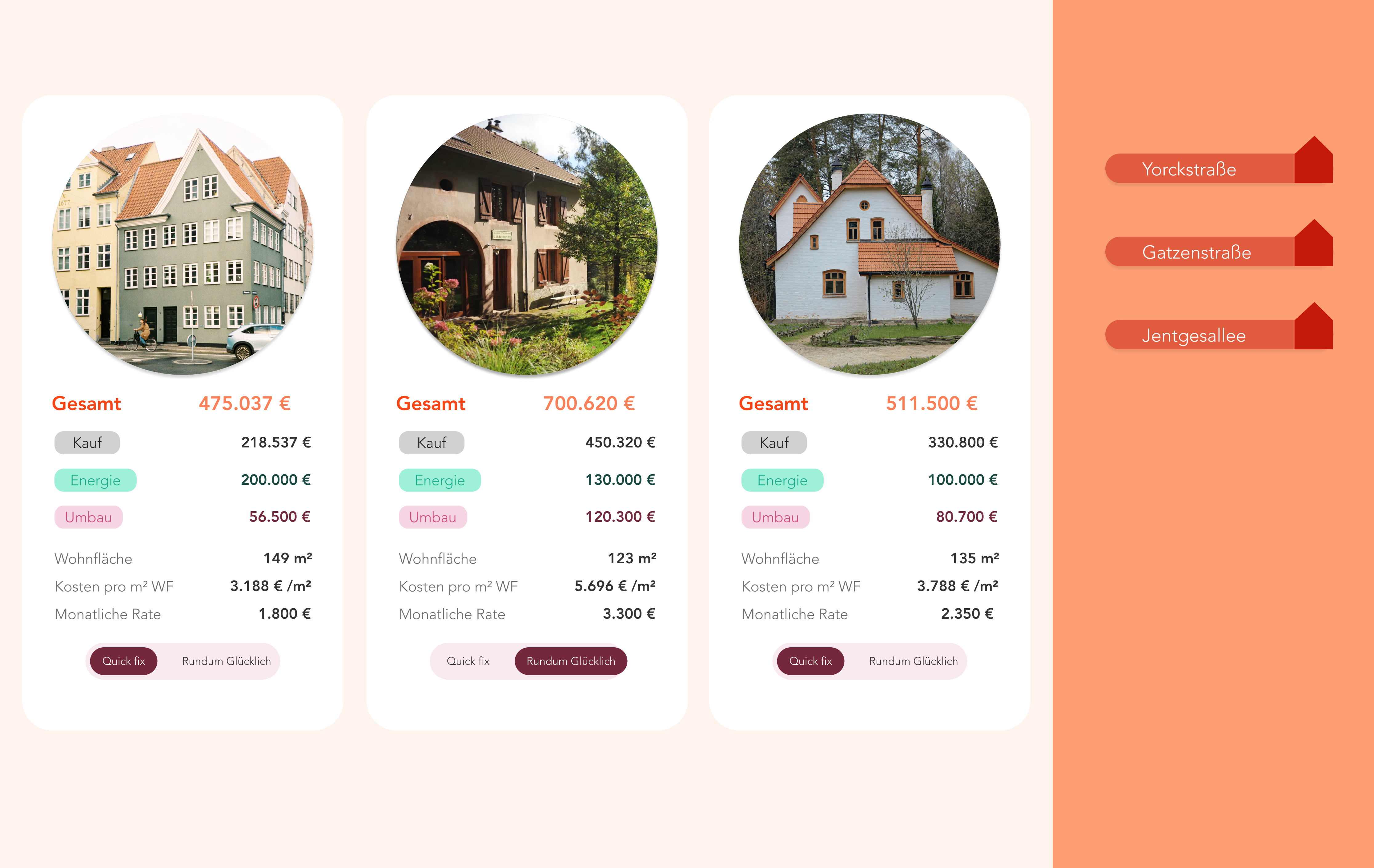 Unser Renovierungsrechner zeigt dir auf einen Blick die Gesamtkosten für Kauf, Renovierung und energetische Sanierung. Du siehst die Kostenrange von Minimum bis Maximum, kannst Objekte vergleichen und erfährst direkt, wie sich die Finanzierungsrate pro Objekt verhält.